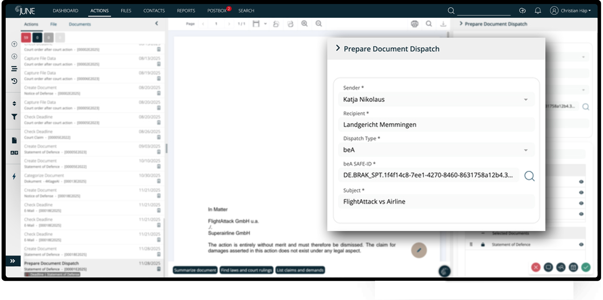 beA is fully integrated into JUNE’s workflows. Incoming messages are automatically retrieved and transferred to the processing flow. The file number and other information are immediately added to the file. Created letters can be sent directly via beA without leaving JUNE. Attachments can be sorted directly from the file and added in the desired order. Security is paramount. The required certificate for a beA mailbox is stored in a highly secure data vault. Lawyers have control over their certificates and the letters sent via their mailboxes at all times.