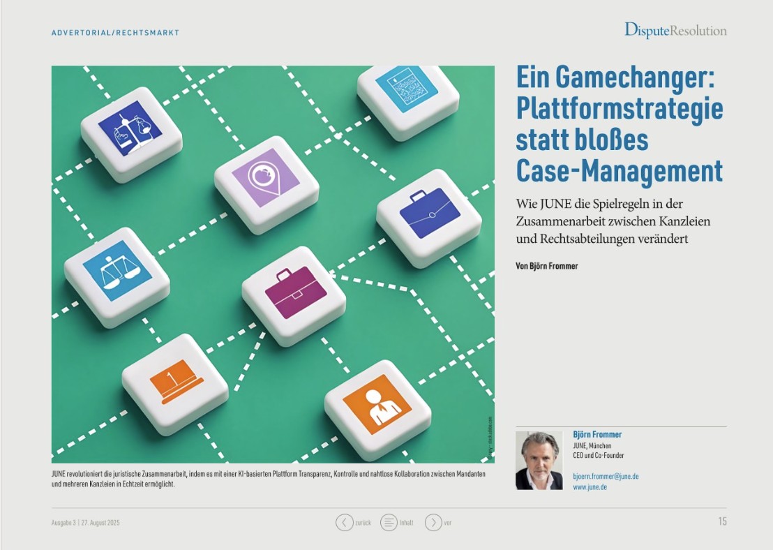 What is required is a system that structures legal work in real time and makes it analyzable and transparent. JUNE demonstrates how this can be achieved — not as law firm software, but as infrastructure for a new understanding of case management: connected, data-driven, and collaborative.
